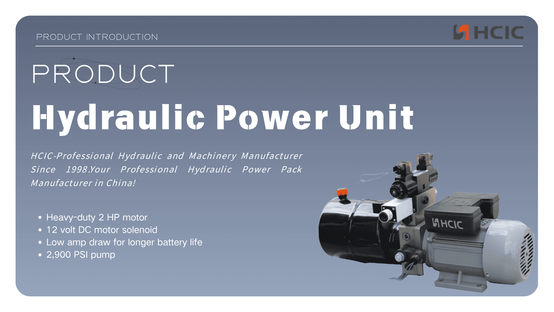 ХЦИЦ 12В Хидраулична јединица за напајање – запремине 2,1 цц, мотор од 2 КС, пумпа од 2900 ПСИ, лагана 40 лбс, ниска потрошња снаге за дуг век батерије, савршена за ДЦ хидрауличне системе.