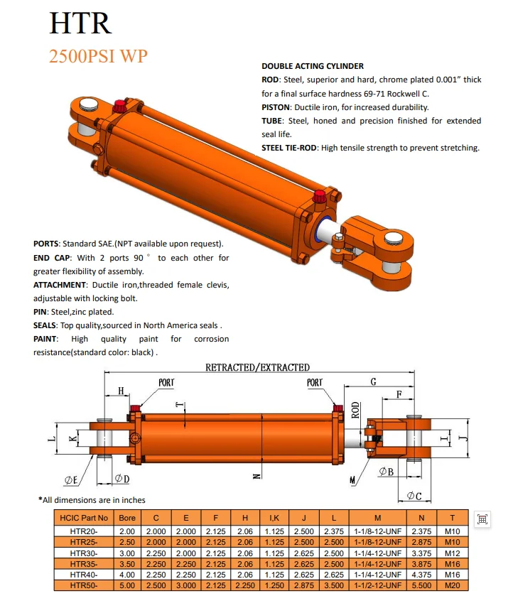Овај ХЦИЦ стандардни заварени цилиндар има отвор од 4 инча, ход од 36 инча и шипку пречника 2 инча. Доубле-Ацтинг САЕ 8 (-08) ОРБ(Ф) радни портови 2.500 ПСИ максимални радни притисак Спојнице Укључене су игле за монтажу од 1 инча Сјајна црна боја је издржљива и отпорна је на бледење